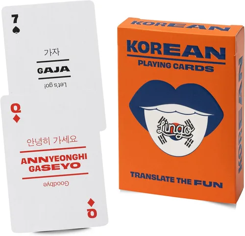 Tarjetas de juego divertidas globales: desde el cautivador mundo del K-pop y el delicioso kimchi hasta los adictivos K-dramas y los elegantes hanboks, sumérgete en la vibrante cultura coreana. Las cartas y las tarjetas se han combinado en este enfoque innovador para el aprendizaje de idiomas, lo que lo convierte en la forma más entretenida y efectiva de aprender coreano y repasar tus habilidades lingüísticas. Baraja de juego estándar: cada baraja de cartas tiene 54 de las frases más útiles para conocer en Corea, completas con pronunciaciones fonéticas, y cuenta con una baraja convencional de 52 cartas y dos comodines. Estas tarjetas flash proporcionan una introducción al popular Lingo coreano y son ideales para los estudiantes de idiomas que recién comienzan Explora y juega sin fin: di "Annyeonghaseyo" para saludar a nuevos amigos y dominar el arte de pedir deliciosa comida callejera como un profesional. Embárcate en un viaje lingüístico que te llevará por las bulliciosas calles de Seúl con confianza y una sonrisa. Ahora puedes aprender y jugar tus juegos de cartas favoritos como Poker, Black Jack, Spoons, Rummy, Go Fish, Memory, Crazy Eights, Hearts y Solitaire. Confía en nosotros, con estas cartas en tu mano, serás de quien todo el mundo habla. Pide tu Lin Premium y elegante: las cubiertas están hechas de materiales de alta calidad para garantizar la durabilidad y longevidad de cada tarjeta. No más esquinas dobladas, no más tarjetas desgastadas, solo una baraja suave y duradera que está lista para la acción. También hay una caja brillante para mayor comodidad al viajar. Ideal para regalos de vacaciones y rellenos de calcetines. Método de aprendizaje de idiomas genial: deja que el espíritu de Corea encienda tu curiosidad y te acerque al corazón de este fascinante país. Descubre la magia del idioma coreano y abraza una cultura que combina tradición y modernidad sin problemas. Las barajas de cartas Lingo vienen en la mayoría de los idiomas populares como: irlandés, jamaicano, persa, mandarín, español, italiano, alemán, japonés. ¡Aprende un idioma con naipes únicos!
