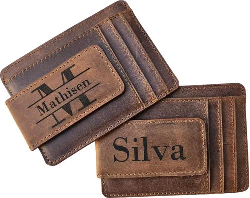 Cartera personalizada con clip para dinero para hombre, billetera delgada de cuero grabado personalizado con bolsillo frontal con clip magnético
