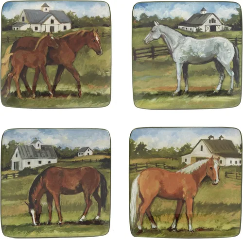 Incluye: platos de canapé/almuerzo/aperitivo York Stables de 6 pulgadas, juego de 4 diseños surtidos Fabricado con loza duradera Dimensiones del artículo: 6 "x 6" x .75" Con hermosas escenas de caballos; perfecto para cenas casuales y entretenimiento; ideal para regalos de inauguración de la casa y ducha Apto para lavavajillas y microondas solo para recalentar