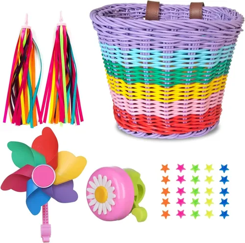 Cesta de bicicleta para niñas, cesta de bicicleta ajustable para manillar delantero con serpentinas de bicicleta, juego de campana/molino de viento