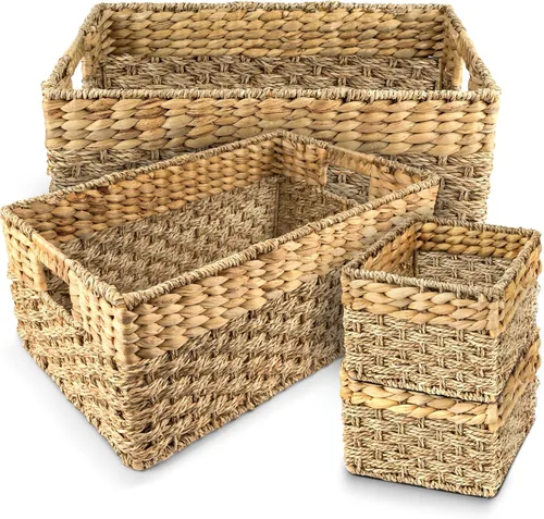 Naturalmente seguro y hermoso: aporta calidez y encanto con nuestras cestas de almacenamiento para organizar, hierba marina natural y jacinto, sin productos químicos, ecológicas. Nuestra cesta de mimbre hecha a mano cuenta con un acabado suave y tejido, belleza duradera sin deshilacharse ni bordes afilados Fuertes y diseñadas para durar: estas cestas de almacenamiento de jacinto de agua soportan hasta 20 libras, perfectas para libros y artículos esenciales, incluye un tejido apretado, marco de hierro reforzado que garantiza durabilidad. Este contenedor de almacenamiento de mimbre es ideal para cestas decorativas de estante. Fácil agarre, fácil de transportar: cesta de almacenamiento con asas para un agarre cómodo, fácil de levantar. Cestas de mimbre premium para regalos. Cada transporte, sin esfuerzo. Incluye (L) 17.5x11x7.5 pulgadas (M) 15.5x9.5x6.5 (S-2PK) 8.25x7x5.5 pulgadas. Puede variar en (±¼") de la artesanía a mano Limpieza sin esfuerzo, belleza duradera: mantén tus llamativos contenedores de almacenamiento de mimbre con un aspecto fresco con una limpieza rápida. Esta cesta de jacinto de agua es fácil de limpiar, simplemente utiliza un paño suave o un plumero. Disfruta de una limpieza sin complicaciones y una belleza duradera. Almacenamiento elegante para cada espacio: estas cestas tejidas para almacenamiento mantienen tu espacio ordenado y elegante. Utiliza estas cestas decorativas de organización para juguetes, mantas, lavandería, libros, despensa, suministros para mascotas o decoración. Práctico para hogares acogedores y organizados