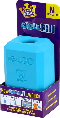 ¿Tienes un cachorro que está un poco nervioso cada vez que sales de casa? Aquí está la manera perfecta para que se relaje. El relleno Chew King Chill está hecho de goma natural no tóxica y se adapta a una comida de golosinas para casi cualquier cachorro, viene en tres tamaños diferentes, todo en una forma que hace un desafío divertido para tu mascota. "Alimentación congelada": simplemente llénala con la croqueta favorita de tu cachorro, agrega un poco de agua y estaciona un Chill Fill en tu congelador. La próxima vez que salgas por la puerta, quieres frenar un poco la hora de la cena, o simplemente quieres darle un capricho a tu amigo, sácalo y míralo ir felizmente a la ciudad.