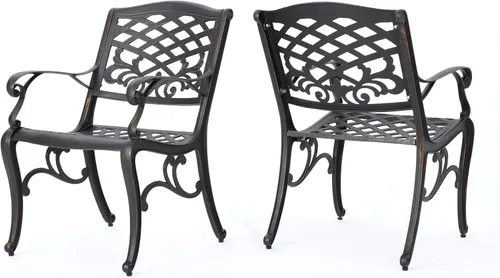 Incluye: dos (2) sillas de comedor Material: aluminio fundido. Acabado: Cobre brillante. Requiere montaje. Detalles hechos a mano. Dimensiones: 26. 30 pulgadas de profundidad x 22 pulgadas. 30 pulgadas de ancho x 35. 00 pulgadas de alto Anchura del asiento: 19. 50 pulgadas. Profundidad del asiento: 18. 50 pulgadas. Altura del asiento: 17. 75 pulgadas. Altura del brazo: 25. 50 pulgadas.