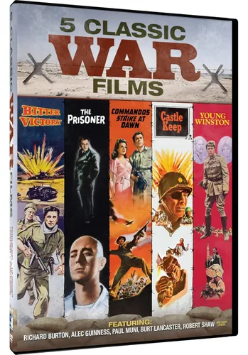 To Arms!Young Winston (1972) - Color - PG Simon Ward, Robert Shaw, Anne Bancroft, Anthony Hopkins Played by Simon Ward, young Churchill is ambitious and over-eager, with a tendency toward boastful over-exaggeration and opportunism, all of which served him well in overturning the low expectations of his father. The film flashes back through three main periods of Churchill's life narrated by the older, knowing Churchill. In boyhood and adolescence, Churchill's self-consumed parents, Lord Randolph and American-born Lady Jennie, are too busy with their own lives in Parliament and social engagements to see him off to boarding school, a task fulfilled by a beloved nanny.The Prisoner Alec Guinness, Jack Hawkins Two Legendary Actors at the height of their careers face off in a film so controversial that both the Cannes and Venice Film Festivals banned it. Following World War II, a strong-willed cardinal is arrested as a traitor to the state. His will is strong, but so is that of his inquisitor, a seemingly benevolent man who uses oily charm to lure the cardinal into speaking freely. The interrogator eventually resorts to false evidence, dirty tricks and cruelty. Months pass, and the cardinal's spirit seem impossible to break. As the interviews become increasingly hostile, the captors turn to the last bastion of the immorally powerful. Eventually the cardinal is exploited and destroyed.Commandos Strike at Dawn (1943) - B&W - Not Rated Paul Muni, Lillian Gish, Sir Cedric Hardwicke, Anna Lee Oscar-winner Paul Muni gives a dynamic performance in this dramatic World War II story. Muni plays Erik Toresen, a simple Norwegian fisherman who finds his quiet coastal village shattered by the Nazi invasion. Untrained in the ways of war, the villagers use only their cold, sullen hatred as defense. But when an elder member of the community is maimed and, Muni mobilizes the villagers and trains them to fight. Eventually discovered by the Germans, Muni and four others escape to England to lead British troops against the Germans, who intend to attack the Arctic supply lines.Castle Keep (1969) - Color - R Burt Lancaster, Jean-Pierre Aumont, Peter Falk, Scott Wilson Near the end of World War II, American Major Falconer leads his weary eight-man squadron to a perfectly preserved medieval castle in the Adrennes Forest. CASTLE KEEP's owner, the aging Count of Maldorais, shelters the servicemen in hopes they will defend his fortress and his priceless collection of art masterpieces from the advancing German troops. But the servicemen have plans of their own. Major Falconer begins an illicit affair with the Count's beautiful young wife, while Sgt. Rossi romances the wife of an absent baker. As the German soldiers push forward, a deadly game of possession ensues, leading to a spectacular ground battle for keeper of the castle. Bitter Victory (1957) - B&W - Not Rated Richard Burton, Curt Jurgens, Ruth Roman A Word War II drama starring Richard Burton and Curt Jurgens as Captain Leith and Major Brand, a pair of British Army officers assigned to execute a daring commando raid on the Libyan stronghold of General Rommel. Even before the mission begins, the tension between the two is evident. This is further exacerbated when Brand learns that Leith and his wife were once romantically involved. Once the operation is underway, Leith must save the day when Brand's cowardice is revealed, thus putting the mission and the lives of the men in jeopardy. As they struggle through the wastes of the Sahara we learn who will live, who will die and what is the price of glory.