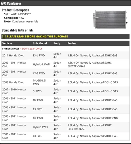 Pregunta sugerida sobre Condensador A/C - Compatible con Honda Civic Sedan 2006-2011 de 4 puertas ¿Este producto sí me sirve para lo que necesito?