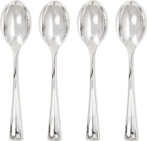 Cucharas de plástico en miniatura para salsas, condimentos, salsas y postres; sin BPA Paquete de 24 mini cucharas en acabado plateado metálico Cada cuchara mide aproximadamente 4 pulgadas de largo El color plateado metálico combina con cualquier tema de fiesta y se ve como el real Vea más colores y opciones de cubiertos de plástico y piezas para servir buscando Trend ware
