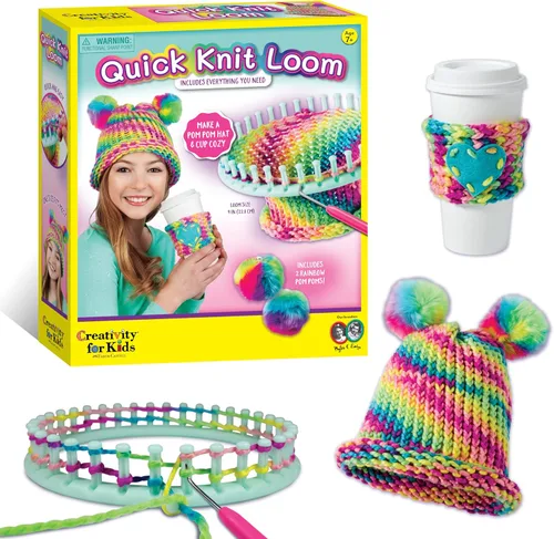 MAGIA DEL TELAR Y DEL GANCHO DE PUNTO: ¿Quién hizo este gorro colorido y acogedor?! Descubre la diversión de tejer en telar con el telar Creativity for Kids Quick Knit Loom, una manera fácil y emocionante para que los principiantes tejan, envuelvan el hilo en un telar de punto para crear accesorios suaves. Con hilo arcoíris brillante y guía simple, esta artesanía es perfecta para el tiempo de inactividad creativo, diversión sin pantalla y aventuras prácticas de manualidades para niños a partir de 7 años KIT TODO EN UNO DE TELAR PARA PRINCIPIANTES: ¡Todo lo que necesitas para comenzar tus primeras creaciones de tejido en telar viene en un set completo! Los niños pueden comenzar de inmediato con 82 metros de hilo arcoíris, un telar redondo de 23 cm, pompones, gancho de tejer, parche de fieltro, aguja de plástico, enhebrador e instrucciones ilustradas, además de un video de instrucciones. Este conjunto fácil para principiantes también es una opción divertida para niñas de 7 a 8+ años que disfrutan de proyectos creativos Tejido relajante y consciente: los movimientos suaves y repetitivos del tejido de telar crean una actividad relajante que fomenta la concentración, la atención plena y la independencia creativa, lo que hace que este kit de tejido de telar sea perfecto para la relajación después de la escuela o para manualidades acogedoras de vacaciones. A medida que los niños enrollan su hilo alrededor de cada clavija, desarrollan naturalmente habilidades motoras finas, coordinación mano-ojo, planificación y resolución creativa de problemas CREA DIVERSIÓN QUE SE PUEDE USAR: Esta alegre artesanía hace maravillosos regalos de Navidad para niños o sorpresas de cumpleaños para jóvenes creadores que aman la creatividad práctica. También es un kit de tejer especialmente genial para niños de 8 a 12 años o más que quieran explorar el tejido con telar. Cuando terminen, los niños pueden usar su sombrero de pompón, envolver un acogedor para tazas alrededor de una bebida favorita, o seguir creando nuevas creaciones con las herramientas reutilizables CREADO POR LOS EXPERTOS EN JUEGO CREATIVO: Fundada en 1976 en Cleveland, Ohio, Creativity for Kids ha diseñado con orgullo manualidades de alta calidad para niños de 7 años en adelante que inspiran la imaginación, desarrollan la confianza y convierten el tiempo sin pantallas en diversión práctica. El kit de telar de punto rápido no es tóxico, está probado en seguridad y es para niños. Confiados por los padres y amados por los niños, hemos estado creando alegría durante generaciones