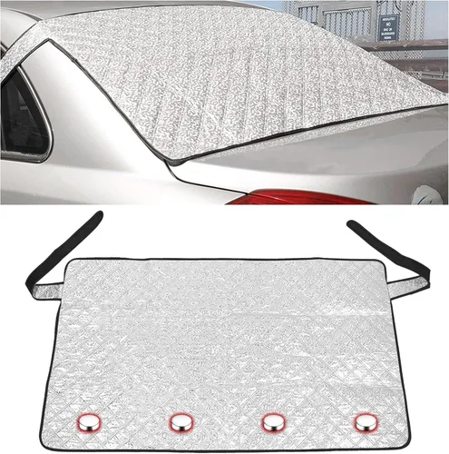 【Práctico y conveniente】: La cubierta del parabrisas trasero ayuda a evitar que la lluvia y la nieve cubran el coche en invierno, bloqueando la vista o causando que el hielo dañe los cristales. Poner esta cubierta en la ventana trasera puede resolver el problema de raspar la nieve y eliminar el hielo, ahorrando tiempo y esfuerzo. 【Doble protección】: hay 2 solapas largas antirrobo para puertas en la parte superior que se pueden sujetar firmemente en la puerta del automóvil y son difíciles de extraer. Además, el parabrisas trasero tiene 4 imanes, que pueden mantener mejor la cubierta de nieve en su lugar y garantizar que se ajuste mejor al parabrisas trasero. La doble protección garantiza que la cubierta y la ventana trasera se ajusten firmemente y no se caigan. 【Material de 4 capas】: La lámina de aluminio superficial tiene alta retardancia de llama, es impermeable y a prueba de agua, y es antiarañazos. Las capas medias de algodón spunlace y algodón de urdimbre y trama pueden aislar el alto calor del sol para preservar la temperatura dentro del automóvil durante mucho tiempo. El forro interior no tejido no daña la pintura del coche y puede evitar que la cubierta se adhiera a la ventana trasera debido a las altas y bajas temperaturas. 【Fácil de usar】: Coloca la cubierta plana sobre el parabrisas, engancha las solapas largas en las puertas de los asientos traseros. El imán se ajustará automáticamente al parabrisas trasero para completar la instalación. Cuando se ensucie, simplemente límpialo sin dejar residuos. Se puede almacenar fácilmente simplemente plegándolo cuando no esté en uso. 【Universal】: El tamaño de esta cubierta para ventana trasera de coche es de 31.5 × 55.11 pulgadas, adecuada para el parabrisas trasero de la mayoría de los modelos de coche del mercado. Pero antes de comprar, mide el tamaño de tu parabrisas para asegurarte de que el producto se ajuste.