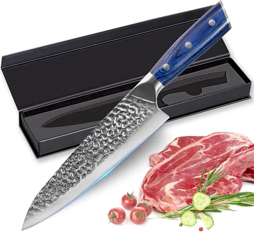 Excelente cuchillo de chef completo: el cuchillo de chef está pulido a mano por artesanos con décadas de experiencia, hecho de acero inoxidable alemán de alta calidad. Dureza Rockwell 58-60 HRC. Resiste el óxido, la corrosión y la decoloración. Puede realizar muchas tareas de corte de cocina, es adecuado para uso doméstico o profesional, cortar verduras, mariscos, frutas o carne. Afilado, bellamente diseñado y corta con facilidad: este cuchillo se corta como un accesorio de barco a través del agua. El mango ergonómico y el borde afilado elegantemente curvado están hechos para cortar, picar y cortar en dados sin esfuerzo. El mango de madera remachado azul es hermoso, fácil de agarrar y se adapta muy suavemente a tu mano. Los tres remaches decorativos encajan perfectamente en las asas. Durabilidad y diseño resistente: el cuchillo cuenta con una hoja gruesa y pesada con hermosos hoyuelos de martillo para evitar que se pegue. Este juego de cuchillos de chef tiene un grosor de hoja de 0.098 in y un ángulo de corte de 14-16° en ambos lados. Este cuchillo está bien construido y durará años con el cuidado y mantenimiento adecuados y será una gran adición a cualquier juego de cuchillos. Peso y equilibrio perfectos: el peso es uniforme entre la hoja y el mango, lo que es artesanía y materiales de calidad. Es el equilibrio adecuado de lo suficientemente pesado para el control y la presión adecuados y no demasiado pesado para precisión y velocidad. Recomendamos que el usuario no corte vidrio, piedra u otras superficies duras, o trate de cortar a través de huesos. Ideal para regalar: este cuchillo viene en una caja de embalaje muy bonita y la calidad de construcción es genial, por lo que es el regalo perfecto para cocineros principiantes y profesionales, ancianos, seres queridos o amigos. Es un gran cuchillo de cocina y hace que la preparación de comidas sea muy fácil. Nunca tengas un momento aburrido con este cuchillo en tu cocina