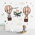 Yovkky Calcomanías de pared de globo aerostático para avión, lindos animales, aviones, león, zorro, mapache, nube, estrellas, neutro, decoración de