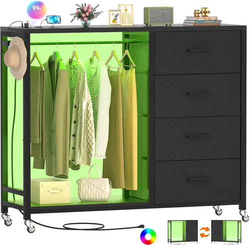 👗【Cómoda con Perchero】Esta cómoda tiene un diseño 2 en 1 (cómoda + armario), con este práctico perchero, que es útil para colgar tu ropa diaria, y conveniente para colocar tus bolsas en el estante inferior. 4 cajones anchos y profundos al lado del estante pueden contener 70-100 calcetines, 40-50 abrigos o 60-70 jeans. Adquiere este mueble de armario integrado, puedes colgar y almacenar tu ropa y accesorios de manera más conveniente sin necesitar 2 muebles. 🧦【Cajonera con estación de carga】 Esta cajonera ancha y alta tiene 3 enchufes incorporados y 2 puertos USB en el escritorio y puede cargar 5 dispositivos al mismo tiempo. Una estación de carga tan práctica es conveniente para usar a su alcance. 【Luces LED encantadoras y mágicas】 Este mueble de vestir equipado con tiras de luz de más de 6000 colores, puedes personalizar cualquier color que desees. Con su sincronización y ritmo con la función de música, puedes disfrutar y crear cualquier ambiente en casa. 👚【Amplio y diverso almacenamiento con ruedas】Con las ruedas bloqueables, puedes mover el mueble de forma fácil y colocarlo en cualquier habitación que necesites. El cajón es dos veces más grande que los demás. (Tamaño del cajón: 18.8 x 15.7 x 7.48 pulgadas). El estante de tela puede contener 15-20 camisetas. También estamos equipados con 2 ganchos como regalo, por lo que es práctico para colgar tus sombreros, bufandas, etc. Con el escritorio de madera puedes colocar tu hermosa decoración o cualquier otra que te guste. (Tamaño del escritorio: 45.2 x 15.7 pulgadas) 【Versión izquierda/derecha y amplio uso】 El mueble puede instalarse en la versión izquierda o derecha, dependiendo de tus necesidades. Es perfecto para el dormitorio, entrada.
