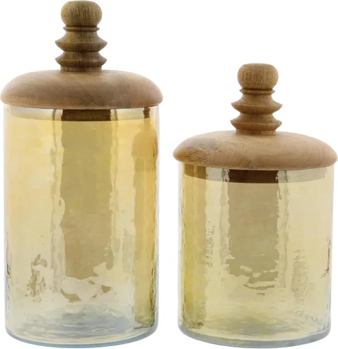 ¿Para qué sirve Deco 79 Tarros decorativos de vidrio para sala de estar, contenedor decorativo con tapas de madera, juego de 2 tarros con tapa de 8 pulgadas, 11?