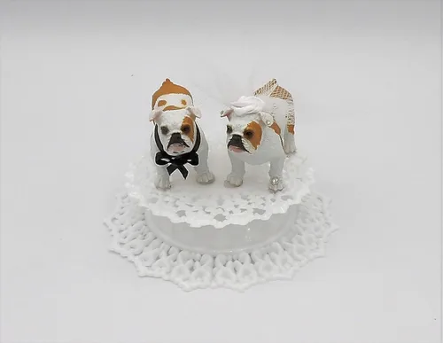 Decoración para pastel Bulldog Bride and Groom sobre base blanca La decoración para pastel mide 4 pulgadas de ancho y 3 pulgadas de alto; se adapta a pasteles de 6 pulgadas o más grande.