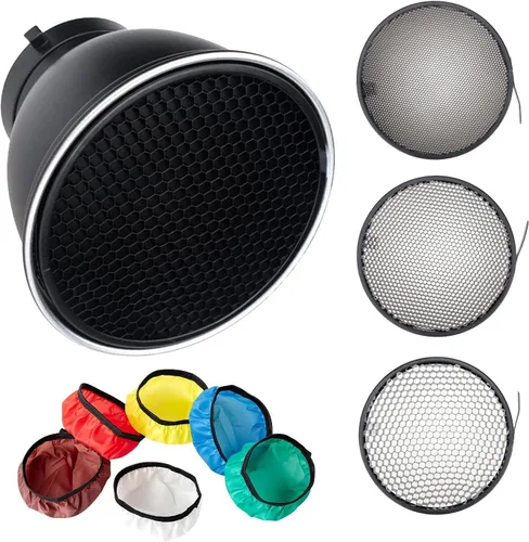 🌈【Soporte reflector estándar de alta resolución】Productos de aluminio, textura reflectante única y exquisita en el interior, para una excelente salida de luz, hace que la salida de luz sea más suave y más enfocada. 🌈【Amplia compatibilidad】Viene con rejillas de panal de abeja de 20°, 40°/60°, pueden reducir la luz de la pantalla de tu lámpara y proporcionar un excelente efecto de sombra. Alteran la forma y la intensidad de la salida de luz de tus cabezales de flash. El uso de una cuadrícula dará como resultado un pequeño círculo de luz, cuando esté unido a la parte frontal de su fuente de luz. Viene con un paño suave blanco para suavizar la salida de luz. 🌈【Múltiples escenarios de uso】Con paño ligero suave de 6 colores, se pueden crear escenas y colores no utilizados. Este juego es perfecto para fotografía de productos, publicidad, figuras, retratos, arte, bodas, etc. 🌈【Lo que obtienes】1 difusor reflector estándar; 1 kit de rejilla de panal de abeja de 20°40°60°; 1 kit de tela ligera suave de 6 colores. Servicio al cliente amigable, durante 30 días después de la fecha de compra, recibe una garantía de reembolso completa por cualquier motivo. Garantía de 24 meses para problemas relacionados con la calidad. PD: ponte en contacto con nosotros si el paquete viene sin los difusores de color anunciados