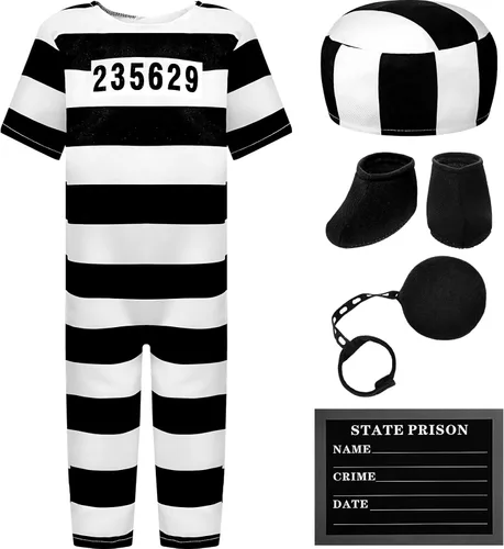 Disfraz estilo prisión: recibirás 1 juego de overol a rayas blancas y negras, incluyendo uniforme de prisión, botines, sombrero, pelota de cárcel, esposas de juguete y tarjeta de información de prisión; la combinación completa puede satisfacer tus necesidades en Halloween Suave y ligero: el disfraz de prisionero está hecho principalmente de fibra de poliéster, ligero y transpirable, suave y cómodo, no se decolora ni rompe fácilmente, fácil de lavar y limpiar, lo que puede acompañarte durante mucho tiempo Información importante sobre las tallas: antes de pedir el traje de prisionero, utiliza una imagen de la tabla de tallas y no bases tu selección en la edad o el tamaño de la ropa de tu hijo, para evitar hacer la elección equivocada y asegúrate de que tu hijo pueda ponerse el bonito disfraz lo antes posible Disfraz divertido y realista: el disfraz de prisión se ve divertido y juguetón, puedes escribir la información en la tarjeta de prisión, sostener la tarjeta de mensaje de la prisión en tu mano o llevarlo en tu pecho, para crear una sensación de crimen más realista Buena opción en muchas ocasiones: el disfraz de cárcel para niños se puede usar en muchas ocasiones, como fiestas de Halloween, fiestas temáticas de prisión, fiestas familiares en prisión, obras de teatro y otras actividades al aire libre