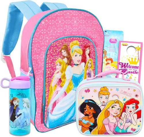 Disney Juego de mochila y lonchera de princesa para niñas, paquete con bolsa escolar de princesa, bolsa de almuerzo, calcomanías y botella de agua