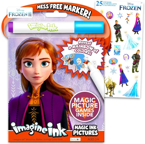 Disney Frozen Imagine Ink - Juego de libros ilustrados sin desorden con Elsa y Anna de Frozen. Incluye un paquete de calcomanías de Disney Frozen. El juego de tinta y calcomanías Imagine cuenta con personajes de Disney Frozen en un libro de imágenes de 12 páginas, además de 1 marcador de tinta Imagine sin problemas. El libro de imágenes de Disney Frozen Imagine Ink utiliza un marcador libre de desorden para revelar un arco iris de colores mientras dibujas en la página. Diseñado para ser utilizado con el marcador de tinta mágico incluido, un marcador transparente que no marcará visiblemente la mayoría de los otros artículos. Gran diversión para cualquier pequeño fanático de Disney Frozen. Perfecto como suministros de fiesta de Disney Frozen y regalos de fiesta. El arte de la portada puede variar de una temporada a otra..