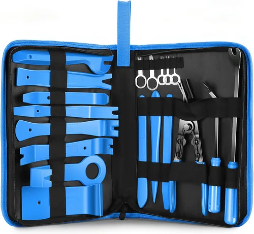 HERRAMIENTAS DNA DE ALTA CALIDAD - Nuestros técnicos concienzudos realizan controles de calidad y una investigación exhaustiva al probar aplicaciones de automóviles y accesorios de nuestros productos. Para garantizar una alta resistencia y durabilidad, diseñamos los productos solo con materiales de alta calidad. Útil kit de herramientas para automóvil: este kit de herramientas de extracción de molduras de 19 piezas es ideal para instalar o quitar el sistema de audio/radio del automóvil, paneles de puertas, molduras, emblemas, adornos de ventanas o reparación de interiores de automóviles y restauración de muebles. Resistente y fácil de usar: diseño ergonómico y ligero, fácil de sostener para ahorrar esfuerzo al recortar varios interiores y exteriores del automóvil. Hecho de fibra de nailon endurecido, tiene la fuerza para levantar los paneles y abrir los pasadores de retención del panel sin pérdida de modificación del coche. FÁCIL DE ALMACENAR Y TRANSPORTAR: Nuestro juego de herramientas para tapicería automotriz viene con una bolsa de almacenamiento portátil para guardar todas tus herramientas después de su uso. No te preocupes por perderlos. El diseño de apertura con cremallera te permite almacenar, organizar y sacar fácilmente las herramientas. El paquete incluye: [11] herramientas de desmontaje de molduras interiores; [2] herramientas de liberación; [2] herramientas de extracción de estéreo; [3] herramientas de extracción de terminales de automóvil; [1] alicates de extracción de clips de moldura; [1] bolsa de almacenamiento portátil