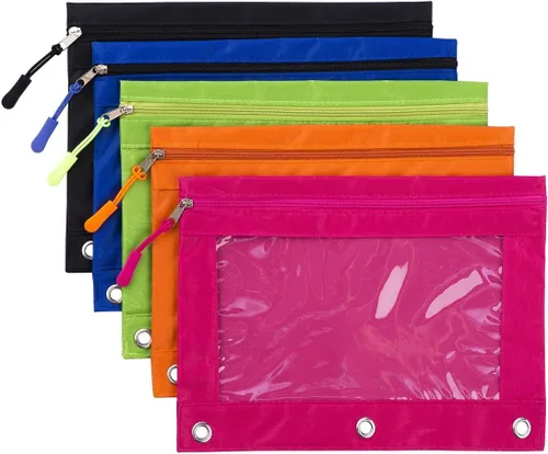 【Material y Tamaño de la bolsa para lápices de 3 anillas: 】Esta bolsa para lápices está hecha de tela Oxford con PVC transparente; Tamaño: (25 × 18 cm) 9.8' × 7'' 【Paquete de 5 unidades en 5 colores diferentes】El paquete de bolsas con 3 aros viene con 5 paquetes en 5 colores brillantes diferentes: negro, azul, verde, rosa, naranja. Comodidad para guardar las diferentes cosas pequeñas 【Bolsa para lápices de 3 anillas que se adapta a las carpetas】La bolsa de 3 anillos se fija en carpetas estándar de 3 anillas, los agujeros reforzados encajan en carpetas estándar de 3 anillas, se pueden colocar en carpetas Ventana de visión clara: el diseño de ventana frontal transparente para estas bolsas te permite ver artículos en el interior, te ayuda a encontrar tus cosas fácilmente 【Cómodo de usar y portátil】Adecuado para guardar tus suministros pequeños en este estuche con 3 anillos con zíper para lápices, como para guardar tus bolígrafos escolares, lápices, marcadores y artículos. Nota ADVERTENCIA: Peligro de asfixia: piezas pequeñas. No apto para niños menores de 3 años. Edad recomendada por el fabricante: a partir de 8 años.