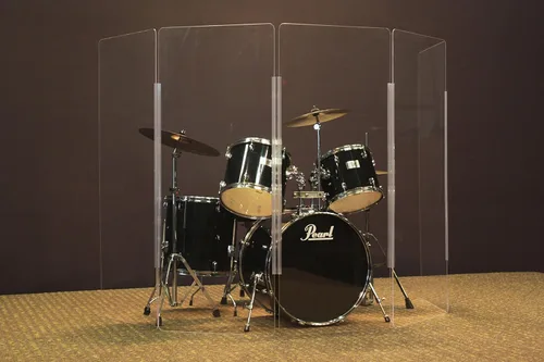 Escudo acústico de batería para reflejar y aislar la batería para un volumen percibido reducido y grabaciones más limpias. Los usos incluyen casas de culto, estudios, escenarios de actuaciones en vivo y cualquier lugar donde necesite aislar el sonido. El escudo de tambor de acrílico aísla los tambores para que el ingeniero de sonido pueda obtener una grabación o mezcla de sonido más clara, al tiempo que reduce el volumen de los tambores en el escenario. Cada panel acrílico mide 5 pies de alto, 2 pies de ancho y 1/4 pulgadas de grosor y es transparente. Cada panel está ruteado a mano para un borde liso y redondeado para un acabado profesional. Los paneles se envían con una gruesa máscara protectora de papel, en una caja de envío duradera y acolchada directamente a tu puerta. Las bisagras flexibles de longitud completa son estándar para todos nuestros productos. Estas articulaciones son una articulación de dureza dual, flexible pero robusta que permite que los paneles se plieguen de forma plana al estilo acordeón para almacenamiento y transporte. Las bisagras cuentan con tres dientes de goma que sujetan de forma segura el panel de 1/4 de pulgada de grosor. Una vez instaladas, no es necesario quitar estas bisagras. Si bien este estilo de bisagra es más caro, creemos que es la mejor opción y sabemos que nuestros clientes están de acuerdo. Todos nuestros productos están hechos a mano aquí en Ohio, Estados Unidos desde 2010. Somos una empresa muy pequeña de músicos, bateristas, guitarristas y artesanos con experiencia en el mundo real, de primera mano con los productos que vendemos y usamos. Nos enorgullecemos de nuestros productos, calidad y artesanía. Las bisagras flexibles permiten una cobertura completa en todo el conjunto de tambores. Las dimensiones de la huella estándar son más de 8 pies de ancho y 3 pies de profundidad para cubrir la parte delantera y envolver alrededor de los lados para un excelente aislamiento del sonido. Las bisagras flexibles permiten que el protector de tambor se envuelva alrededor de los lados de los kits de tambor más pequeños, o se expanda más para cubrir kits de tambor más grandes. Un escudo para tambor = muchas aplicaciones.