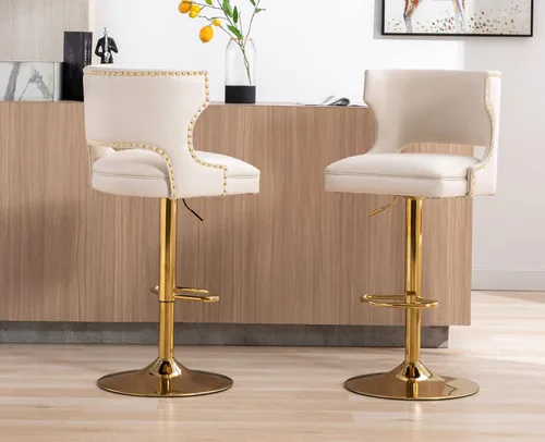 Diseño único: aspecto elegante con respaldo curvo, el delicado borde de la cabeza de clavo, además de la base de metal dorado, estos elementos de moda se unen y hacen que el taburete de isla de cocina sea muy elegante. Puede destacar en cualquier ambiente de habitación de tu hogar Cómodo taburete de bar: los taburetes de bar están hechos de piel sintética vintage, que es impermeable y fácil de limpiar. La forma ergonómicamente curvada se adapta perfectamente a la forma del cuerpo. Puedes inclinarte hacia atrás en la parte posterior de la silla de bar y colocar tus piernas en el reposapiés para una posición cómoda sentada Sillas de bar giratorias ajustables: la silla de bar se puede girar 360 grados. Muy conveniente al chatear con amigos. Con la palanca debajo del asiento, puedes ajustar la silla de bar a diferentes alturas y mantenerla estable. Las alturas del asiento varían de 26.4 a 35 pulgadas Resistente y duradero: la base de este taburete de bar es de 17.7 pulgadas de diámetro y tiene un área de fuerza más grande, por lo que el asiento se vuelve más seguro y estable; el anillo de goma antideslizante y antiarañazos debajo de la base protege tu suelo de arañazos y reduce el ruido mientras gira Envío y garantía - Tenemos múltiples almacenes en NJ, TX y CA, elegiremos el almacén más cercano de acuerdo a su dirección. Devolución y cambio gratuitos debido a problemas de calidad dentro de 30 días, y reemplazo gratuito de accesorios en un año Nota: antes de usar la silla, comprueba si hay arañazos o accesorios faltantes. Si encuentras algún problema, te ayudaremos a resolverlos