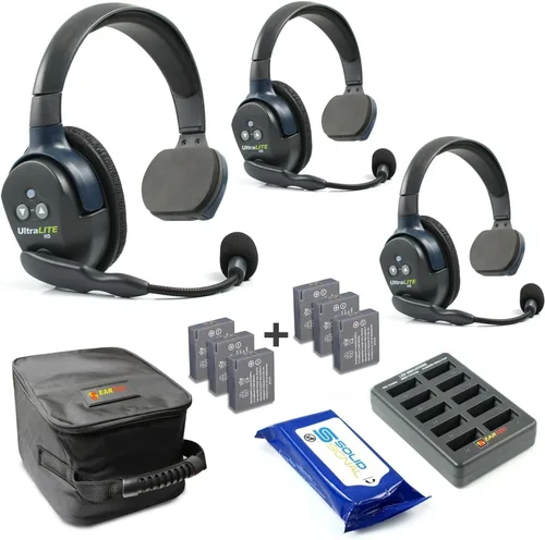 INCLUYE: 1 auricular principal ULSM de una sola oreja, 2 auriculares remotos ULSR de una sola oreja, 6 baterías de litio recargables, cargador multipuerto de 10 bahías, funda suave, toallitas de limpieza Solid Signal DUPLEX COMPLETO MANOS LIBRES: Los auriculares inalámbricos funcionan con frecuencia de 1.9 GHz para evitar interferencias con otros dispositivos; permite la comunicación simultánea para 3 usuarios. RENDIMIENTO EXCEPCIONAL: Alcance inalámbrico LOS de hasta 1,000 pies; hasta 6 horas de tiempo de conversación con una sola carga; el micrófono pivotante permite que los auriculares se usen en el lado izquierdo o derecho. Gran claridad: micrófono con cancelación de ruido que silencia automáticamente cuando gira hacia arriba; comunicación de voz de alta calidad incluso en entornos de alto ruido. PERFECTO PARA: Producción de video, producción escénica, operadores de barcos, operadores de drones, obras de construcción y mucho más