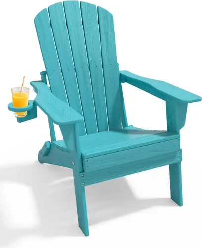 Silla Adirondack plegable mejorada con portavasos para todo tipo de clima, textura de grano de madera premium, HDPE impermeable, adecuada para