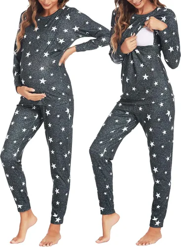 Ekouaer Conjunto de ropa interior térmica de maternidad y lactancia, conjunto de pantalones largos de punto a rayas, capa base superior e inferior