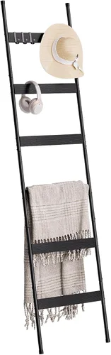 Embellece tu hogar: Ideal para exhibir mantas, edredones, bufandas, periódicos, revistas, el soporte para mantas de escalera de 5 niveles convierte tu desorden en decoración y añade lustre a tu sala de estar, baño y guardarropa Fácil de montar: La instalación es directa, no se necesitan herramientas adicionales, los tornillos y las herramientas adjuntas te ayudan a instalarlo en unos minutos, se utilizan anclajes de pared para fijarlo o simplemente se puede apoyar contra la pared para finalizar la instalación 4 ganchos extraíbles: 4 ganchos adjuntos, extraíbles libremente, dispersos a cada nivel o en línea para mostrar o colgar sombreros, abrigos, toallas, bolsos, cepillos, incluso macetas colgantes Estructura de metal y madera: Hecha de metal con un acabado resistente al óxido y madera, la parte superior de tubo antideslizante y los pies antideslizantes para evitar arañazos en la pared y el piso durante su uso Ahorra espacio: Tamaño de 160 cm x 44 cm con casi ningún espacio en el suelo, pero añade un total de 6 escaleras y 4 ganchos removibles para almacenar y colgar mantas, mientras que su peso ligero permite que sea fácil de mover