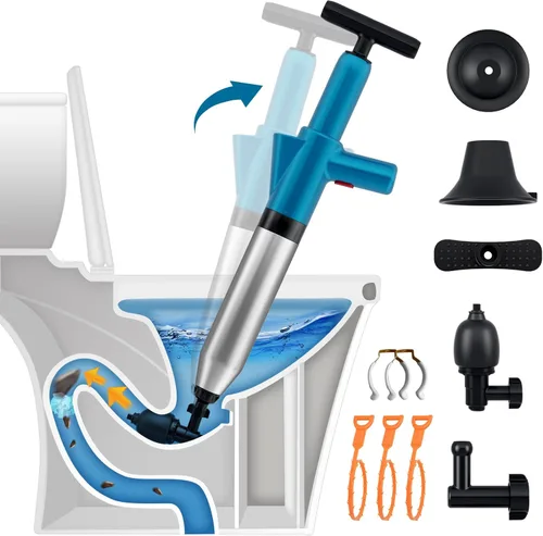 Desatasca las tuberías en cuestión de segundos: la herramienta desatascadora de inodoro utiliza la potencia del aire comprimido de alta presión (máx. 120 PSI) para eliminar los atascos en tuberías en cuestión de segundos. Rápido y más eficaz que los émbolos tradicionales, serpiente de inodoro y taladro de inodoro Fácil de usar: el removedor de obstrucciones de drenaje puede aplicar la presión correspondiente según sea necesario, reemplaza el cabezal del émbolo correspondiente, abre la tapa del inodoro con el abridor de tapa de inodoro, presiona suavemente, resuelve el problema y di adiós al bloqueo. 【Con aguja de presión de aire precisa e intuitiva】El indicador de presión de aire puede observar la actividad neumática y el valor de presión de aire en tiempo real, lo que es más conveniente para que puedas ajustar de acuerdo a diferentes necesidades, y evitar salpicaduras y daños causados por la fuerza excesiva. Materiales de alta calidad: material de acero inoxidable anticorrosión, resistente al desgaste y duradero, sensación cómoda al tacto, extracción de aire suave, seguro de usar, las madres también pueden controlarlo fácilmente. Amplia aplicación: equipado con 5 cabezales reemplazables gratis, un mango flexible y un botón de accionamiento, el producto es fácil de operar sin el costo de un fontanero caro. Se puede utilizar en inodoros, baños, desagües de suelo, fregaderos, alcantarillados y otros escenarios.