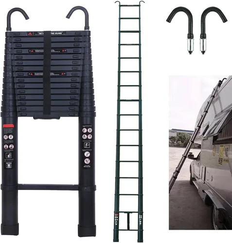 Escalera telescópica de aluminio de 20.34 pies con 2 ganchos de techo desmontables, escalera plegable, escalera portátil ligera para el hogar, escalera de loft, escalera de techo, escalera de techo para caravana, escalera para ático, escalera telescópica Características: Escalera telescópica de aluminio de 20.34 pies Escalera plegable para techo techo Rv Ático... Escalera de escalada para ático, cómoda de usar y fácil de transportar Escalera de extensión totalmente extendida Escalera para ático fácil de usar, fácil de almacenar, peso ligero También puedes ajustar fácilmente la altura de 3 pies a 20.34 pies. Escalera plegable, gran ayudante tanto para uso doméstico en interiores como para actividades al aire libre. Funda de goma antideslizante negra segura y compacta en la parte inferior del escalón de la escalera y múltiples gomas entre dos escalones vecinos para evitar golpes y fricción. Las cerraduras independientes permiten al usuario ajustar la altura de la escalera a requisitos específicos. Se utiliza para pintar paredes, reparar luces de techo, colgar imágenes. Niveles de bloqueo con mecanismo de bloqueo Aprobado por la norma europea de seguridad EN131 Especificaciones: Color: negro Número de escalones de escalera: 15 Intervalo de paso: 15.55 pulgadas Ancho: 19.29 inch Peso neto: aproximadamente 36 libras. Máx. Carga: 330.7 lbs Aprox. Tamaño cerrado: 42.91 pulgadas x 18.90 pulgadas x 3.35 pulgadas Altura desplegada: 20.34 ft / 6.2 m Consejo: El gancho de la escalera se puede colgar en un tubo con un diámetro de menos de 2.8 pulgadas/2.8 in. Especificaciones del gancho de techo: 1. Convierte tu escalera de extensión en una escalera de techo 2. Asegura la escalera en el techo 3. Fácil de instalar y rápido de colocar en la escalera. El paquete incluye: 1 escalera extensible de aluminio de 20.34 pies. 2 ganchos desmontables.