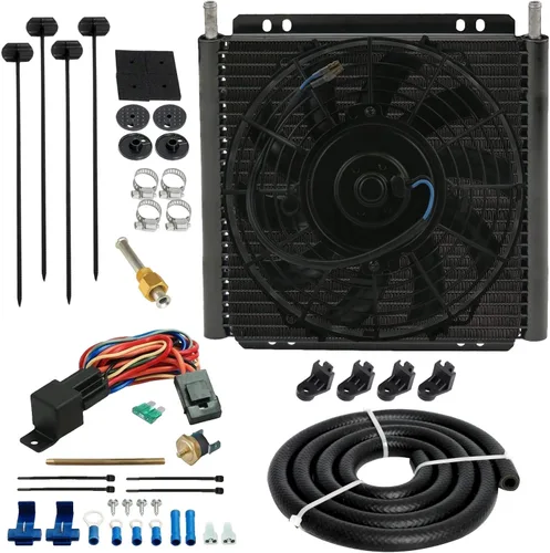 Enfriador de aceite universal de transmisión resistente con ventilador eléctrico de 9 pulgadas. Kit de cableado de relé de interruptor de termostato de temperatura de sonda de aleta a presión. Preserve la vida útil de su transmisión y mejore el rendimiento del remolque. GVWR: Hasta 30,000 libras y remolque: hasta 10,000 libras. Dimensiones: 11.625" x 11" x 0.75", Ajustes: 3/8" pulgadas estilo push-on.