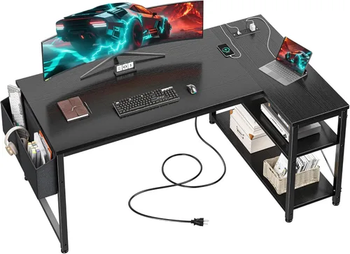 【Escritorio pequeño con amplio espacio de almacenamiento 】Este escritorio de esquina viene con 2 niveles de estantes abiertos para proporcionar un amplio almacenamiento para las necesidades de oficina en casa o estudio y los paneles laterales son accesibles para personalizar tus necesidades de almacenamiento. Los bolsillos laterales de almacenamiento son prácticos para organizar accesorios de juego, suministros de oficina o artículos personales para un fácil acceso. 【Escritorio con puertos de carga USB y tomas de corriente】El escritorio pequeño para computadora está diseñado para las necesidades tecnológicas modernas, este escritorio para computadora integra 2 salidas de CA y 2 puertos. Alimenta sin esfuerzo tu PC, consola, dispositivos móviles y periféricos simultáneamente. Su diseño más humanizado de tomas de corriente también puede evitar el desorden del cable en la carga multidispositivo. 【Diseño en forma de L para espacio de esquina】Este escritorio ergonómico en forma de L cuenta con un diseño reversible de 48 pulgadas, perfecto para estaciones de trabajo duales en oficinas en casa o configuraciones de juegos. La capacidad máxima de carga del escritorio es de 180 libras, escritorio en forma de L para artículos pesados como impresoras y torre de computadora. La configuración del escritorio esquinero maximiza la eficiencia del espacio en cualquier diseño de habitación. 【Construcción estable y resistente】 La mesa de estudio con estantes de almacenamiento está hecha de un marco de metal sólido y una superficie de mesa de madera, con 2 marcos en X para que puedas trabajar o jugar sin temblores, muy estable. Las almohadillas antideslizantes ajustables protegen tu suelo de arañazos mientras que también reducen el ruido. La superficie de mesa de madera impermeable se puede limpiar con un paño húmedo, fácil de limpiar. Instalación rápida de 20 minutos: para que el montaje de estos escritorios de oficina en casa sea lo más fácil posible, enviamos el escritorio de computadora con instrucciones claras y detalladas, piezas numeradas, y el video de instalación está disponible en la página del listado.