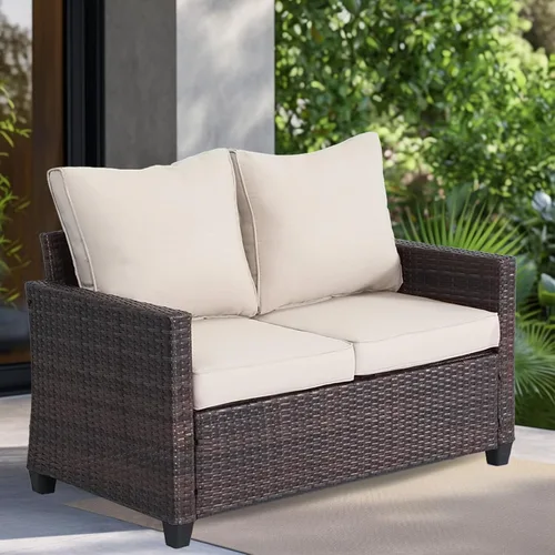 EortheX Sofá biplaza para patio al aire libre, sofá biplaza de mimbre para todo tipo de clima con cojines, sofá de ratán para 2 personas para