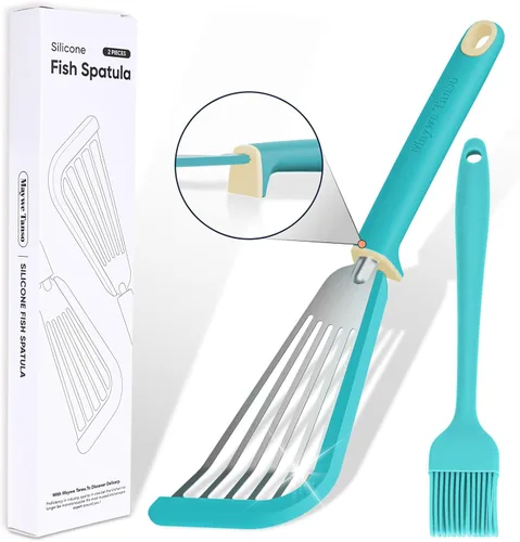 Espátulas de pescado de cocina profesionales: la espátula de pescado de silicona Maywe Tanso es una opción ideal en cocinas profesionales. Principal para peces volteados, huevos y panqueques, etc. Es una espátula de pescado de tamaño mediano para todo. No es tan delgada que se dobla cuando estás volteando un panqueque y no es tan rígida que no puedas meterte debajo del panqueque sin destruirlo. Esta espátula volteadora de peces tiene una aspecto moderno y elegante, también Viene con un cepillo de silicona en una exquisita caja, seguro que deleitará a tus amigos y familiares Más seguro y saludable: prestamos más atención a la seguridad de los materiales de cocina. Nuestras espátulas de cocina ranuradas antiadherentes están hechas de silicona de grado alimenticio, libre de BPA. Más duraderas y tienen una mayor resistencia al calor que las básicas. Incluso a altas temperaturas de 600 ℉ (599.0 °F), no hay necesidad de preocuparse por derretir o deformarse. El borde de la pala de la espátula de silicona está cubierto con silicona. que no rayará tu cocina Proteja mejor su olla. Diseñado para cocinar sin ruido. Actualización y soporte creativo: el mango de silicona antiquemaduras de esta espátula ranurada de pescado no es fácil de conducir el calor, puedes proteger mejor tus manos de quemaduras. Hay un diseño de soporte reforzado detrás del mango, que puede apoyar bien en una encimera cuando no está en uso y evitar que las puntas de silicona toquen la mesa. Además, permite que las espátulas de pescado descansen libremente en el borde de la maceta sin deslizarse. El diseño del agujero para colgar hace que sea fácil de almacenar. Limpio e higiénico, seguro y saludable. Hoja fina de 0.039 in: la espátula de pescado ranurada tiene un borde delgado ancho (0.03 pulgadas de grosor) pero flexible y duradero. Hecho de acero inoxidable 430, te mantiene alejado de la molestia de oxidarse o romperse. Ligero pero resistente. Perfecto para voltear alimentos delicados como tortillas y filetes de pescado, también lo suficientemente fuerte para levantar alimentos más pesados con facilidad como filete. Este girador de pescado ranurado es Fácil de filtrar el aceite al freír alimentos, por lo que es una buena herramienta de cocina para aquellos que les gusta cocinar pescado o panqueques. FÁCIL DE LIMPIAR: Esta espátula de pescado de silicona para utensilios de cocina antiadherentes es fácil de limpiar y usar de forma segura para lavavajillas, lo que hace que la limpieza sea rápida y elimina fácilmente el exceso de grasa y alimentos después de cada uso. Nuestra espátula de pescado con varios colores disponibles para que coincida con tu estilo de cocina u otras series de accesorios. Maywe Tanso Store ha estado mejorando la calidad de los utensilios de cocina y funciones más fáciles de usar, proporcionando a los clientes utensilios de cocina de la más alta calidad