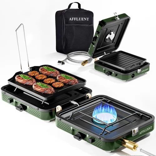 DISEÑO PORTÁTIL Y PLEGABLE: La estufa de camping de propano de doble quemador Affluent, completa con parrilla y bolsa de almacenamiento, ¡es un elemento esencial para el aire libre! Es plegable, por lo que es fácil de guardar en tu coche o mochila, perfecto para acampar y barbacoas. A pesar de su tamaño compacto, no escatima en funcionalidad. Con dos quemadores ajustables, puede cocinar varios platos simultáneamente. El sistema de encendido piezoeléctrico garantiza un arranque rápido y sin complicaciones, lo que lo convierte en una opción confiable para todas sus necesidades de cocina al aire libre. Quemadores potentes y precisos: esta estufa de propano para acampar cuenta con dos potentes quemadores ajustables. Ya sea que esté cocinando una salsa a fuego lento o hirviendo agua rápidamente, estos quemadores lo manejan bien. Como una estufa de campamento de propano de alto rendimiento, ofrece una salida de calor constante. Las perillas de control fáciles de usar te permiten regular con precisión la llama. Ya seas un campista profesional o un principiante, los quemadores de esta estufa satisfarán tus necesidades de cocina durante tus viajes de camping. Parrilla integrada para mayor versatilidad: la estufa de campamento de propano de 2 quemadores destaca por su parrilla integrada. Se convierte en una estación de cocina al aire libre completa. Como estufa de propano para acampar, te permite asar hamburguesas, perritos calientes y mucho más. La superficie de la parrilla distribuye el calor uniformemente para lograr marcas de parrilla perfectas. Es una adición imprescindible a tu equipo de camping, proporcionando variedad de cocina para cualquier amante de las estufas de propano de campamento. Características fáciles de usar: diseñada pensando en los usuarios, la estufa de campamento AFFLUENT tiene un sistema de encendido piezoeléctrico que elimina la necesidad de fósforos. El asa de fácil transporte permite un movimiento suave alrededor del campamento. Con dos quemadores ajustables, puedes personalizar tu cocina. Es perfecto para familias, grupos o campistas solitarios que desean una experiencia de cocina al aire libre sin estrés. Es una excelente opción de propano para estufas de campamento. CONSTRUCCIÓN DURADERA Y CONFIABLE: La estufa de camping de propano de 2 quemadores AFFLUENT está fabricada con materiales de alta calidad. Puede soportar las duras condiciones de uso en exteriores. Su construcción robusta garantiza estabilidad durante la cocción, incluso en suelos irregulares. Esta estufa de camping portátil es una estufa de propano de campamento en la que puedes confiar. Garantiza agradables experiencias de cocina al aire libre cada vez que salgas.
