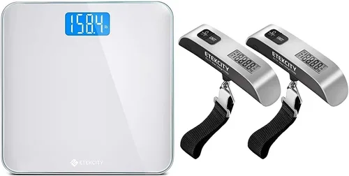 Producto 1: Calidad de primera categoría: No te conformes con menos. Como la marca número 1 en ventas de básculas de peso corporal en los Estados Unidos, Etekcity es conocida por sus productos innovadores y de alto rendimiento. (Fuente: Stackline/Retail Intelligence, Cuota de mercado de datos de Yaxa de EE. UU., febrero de 2019-2021) Producto 1: Diseño elegante: el diseño moderno de esta báscula de peso corporal gris ceniza combina muy bien con cualquier estilo de espacio vital. El diseño de esquinas redondeadas también es más seguro que las esquinas afiladas Producto 1: Exactitud consistente: Benefíciese de 10 años de experiencia profesional. Con la confianza de más de 5 millones de clientes, nos enorgullecemos de nuestros sensores de alta precisión, la tecnología central que es responsable de la precisión de las básculas de peso corporal Producto 1: Fácil de usar: La báscula está equipada con una pantalla fácil de leer con indicaciones de encendido/apagado automático, batería baja y sobrecarga. Elija entre 2 unidades de medida (lb/kg) para su comodidad de pesaje Producto 2: Sensor de alta precisión y superficie de mango con textura de goma. Capacidad: 110lb/50kg, Graduación: 0.1lb/50g Producto 2: Evite las tarifas por sobrepeso: Enganche su maleta para un peso instantáneo y ahorre tiempo antes de esperar en la fila Producto 2: Construido para viajar: Peso antes de ir y colocar la báscula en los bolsillos sin añadir peso excesivo Producto 2: Sensor de temperatura del termómetro tanto en F° como en C°. Sepa que su delicado equipaje está en un clima ideal