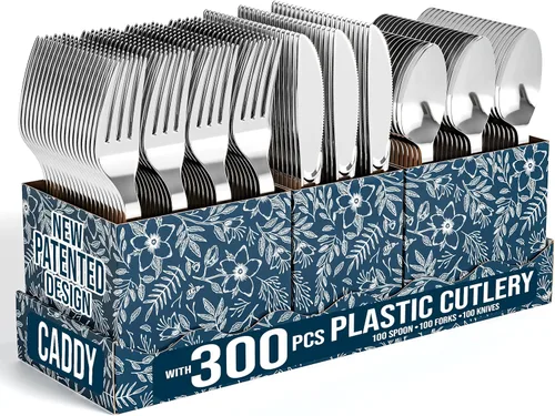 NUEVO DISEÑO PATENTADO: Presentamos el soporte para utensilios con cubiertos plateados, simplemente rasga las líneas perforadas y retira la parte superior para convertirlo fácilmente en una solución rápida y moderna fácil de usar para utensilios de plástico plateado, el mejor organizador de utensilios de oficina y cocina Amplia gama: nuestro juego de utensilios de plástico y soporte para utensilios con cuchillos de plástico, cucharas y tenedores de plástico es perfecto para el hogar y la cocina, oficina y cafetería, sala de descanso, barbacoas. bodas, recepciones, cenas formales, banquetes, fiestas, picnics, suministros de catering, Halloween, Navidad, etc CONVENIENTE: estos cubiertos de plástico con cubiertos desechables de alta resistencia no solo se ven geniales, sino que también son muy resistentes. Estamos orgullosos de decir que nuestros juegos de utensilios duraderos con cucharas desechables, tenedores de plástico resistentes y cuchillos de plástico resistentes están hechos con plástico libre de BPA que también es reciclable. Es la vajilla desechable perfecta para vacaciones y Acción de Gracias Calidad prémium: impresiona a tus invitados esta temporada navideña con este organizador de cubiertos de alta calidad y tenedores desechables, cucharas y cuchillos, juego de vajilla desechable. Cada diseño es único vibrante y puede encontrar un lugar en la cocina o la oficina en casa, juegos de cubiertos de plástico para fiestas o vajillas desechables de boda CUBIERTOS FÁCILES: ¿Necesitas arreglar una fiesta pero no quieres usar tus platos reales? Cubertería desechable de calidad con cubiertos de plástico es definitivamente el camino a seguir. Siempre hay un nuevo aspecto o diseño para cambiar las cosas de la última fiesta y nuestros utensilios desechables de plástico resistentes son justo lo que necesitas para hacer que la fiesta y la limpieza sea muy fácil