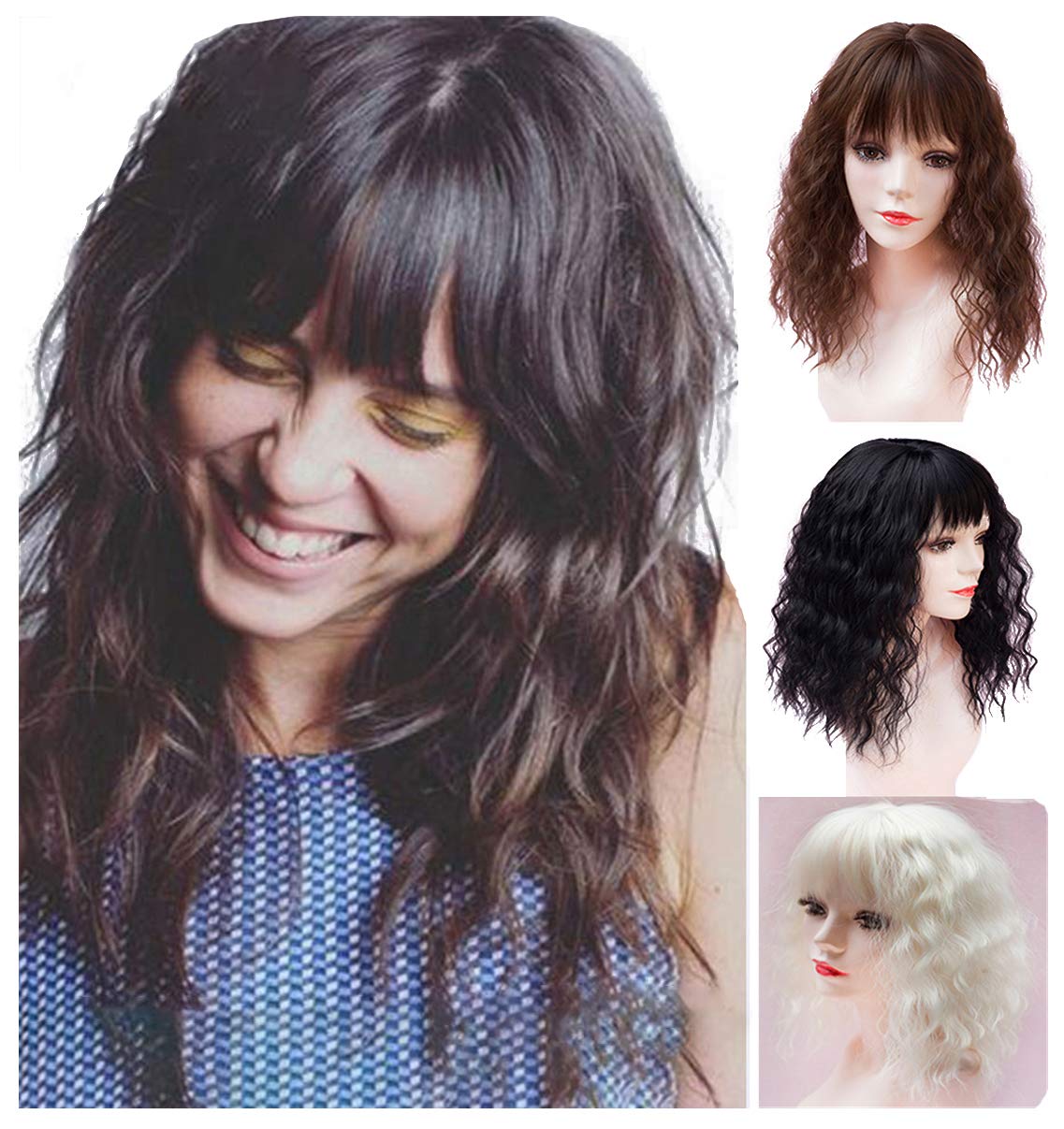 LXUE Extensiones de cabello ondulado profundo con clip con flequillo para mujeres con cabello delgado, 12 pulgadas, rubio 613#
