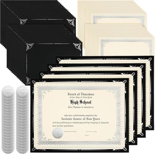 Paquete de combinación abundante: recibirás 100 piezas de juegos de soportes de certificados de un solo lado, que incluyen 100 soportes para certificados con borde de lámina plateada, 100 hojas de certificados de premio con borde de lámina plateada y 100 sellos de certificados de lámina plateada en relieve, y la cantidad suficiente para satisfacer tus necesidades diarias Aspecto Clásico y Profesional: el papel de cartulina para certificados y las hojas de certificados de premios con borde de foil plateado están recortados con tecnología de bronceado, lo cual es elegante y formal como elegante. Y los sellos de certificado de lámina plateada en relieve también son clásicos, el conjunto es adecuado para presentación, ceremonia de premios, campamento de verano Información de tamaño: el soporte para diplomas de premio de un solo lado es de aproximadamente 9.5 x 12 pulgadas / 24.13 x 30.48 cm, cuenta con 4 ranuras en las esquinas, puede sostener bien las hojas de certificados de premio con borde de papel de aluminio plateado de 8.5 x 11 pulgadas / 21.6 x 28 cm vertical y horizontalmente en su lugar, y el sello de papel de aluminio plateado en relieve autoadhesivo es de aproximadamente 1.8 pulgadas / 4.5 cm de diámetro Diseño estructural: hay recortes semicirculares en las 4 esquinas para mantener la cubierta del diploma en su lugar y evitar deslizamientos, lo que se puede aplicar para asegurar la orientación horizontal o vertical de certificados de premios, diplomas, documentos importantes y fotos; simplemente abre suavemente los espacios en las esquinas con las manos e inserta tu certificado o diploma Amplios usos: estas carpetas y papeles de certificado de tamaño carta son compatibles con la mayoría de impresoras de inyección de tinta y láser, lo que podría ser adecuado para la mayoría de las ceremonias de premios en la mayoría de las ocasiones; además, puedes utilizar el papel de premio para imprimir premios de clase, premios académicos e incluso certificados atléticos