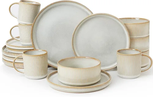 Juego de vajilla Famiware Star con tazas, servicio para 4 (16 piezas), platos y cuencos de gres acanalado, resistentes a las astillas y a los