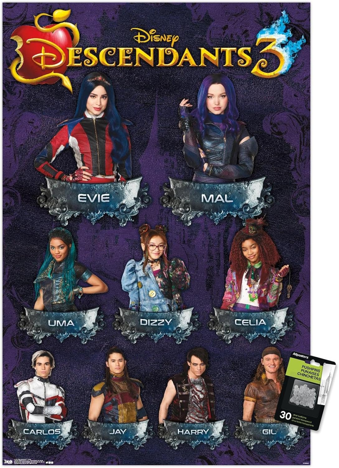 Trends International Disney Descendants 3 - Póster de pared de cuadrícula, 22.37 x 34.00 pulgadas, paquete de póster y alfiler