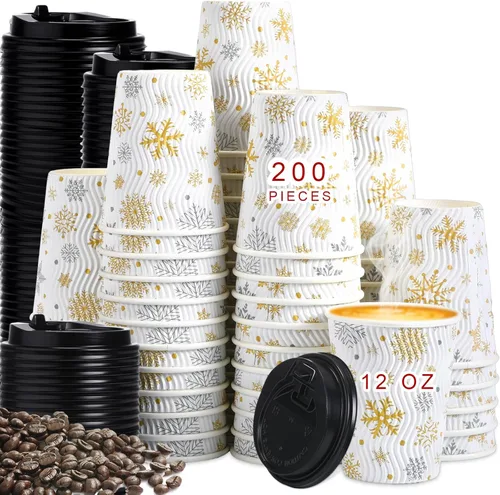 Foaincore Paquete de 200 vasos de papel aislados de Navidad a granel de 12 onzas desechables para café caliente con tapas, vasos ondulados