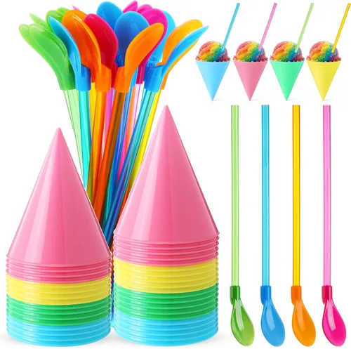 Juego de 20 tazas de cono de nieve reutilizables: el juego incluye 20 tazas de cono de nieve y 20 cucharas de pajita, una buena opción para tazas de cono de nieve reutilizables. Las tazas Candy Colors combinan con cuatro pajitas (verde, azul, naranja, rosa oscuro). Combinan apariencia y practicidad, con suficiente cantidad para compartir fiestas o uso diario Bonito material plástico: estos suministros de hielo afeitado de plástico están hechos de plástico grueso de buena calidad, emparejados con bonitas cucharas de paja sin olor. Como copas de cono de nieve reutilizables, el material duradero resiste la rotura, y el diseño a prueba de fugas evita fugas de bebidas, asegurando una experiencia limpia Cuchara de paja 2 en 1: las cucharas de paja de los coloridos vasos de cono de nieve cuentan con un diseño desmontable 2 en 1, utilizable tanto como popotes para beber como palos de agitación para mezclar bebidas. Cuando se combina con copas de cono de nieve, no se necesita vajilla adicional, especialmente adecuada para mezclar hielo afeitado, batidos y otras bebidas mixtas, ofreciendo más comodidad Agarre cómodo y antiderrames: las copas reutilizables para cono de nieve miden 3.15 x 3.94 pulgadas (aproximadamente 6 onzas), con un agarre cómodo y estable que evita eficazmente derrames. Como suministros de hielo afeitado de plástico, lo que permite un fácil disfrute de bebidas en barbacoas o fiestas al aire libre sin preocuparse por resbalones Versátil para múltiples ocasiones: estos suministros de hielo afeitado de plástico son adecuados para fiestas, barbacoas de verano, reuniones familiares, actividades al aire libre y otras ocasiones. Como coloridas copas de cono de nieve, pueden contener hielo afeitado, helado, batidos, aperitivos y más, compatible con máquinas de cono de nieve, satisfaciendo las necesidades de jóvenes y familias en diferentes escenarios