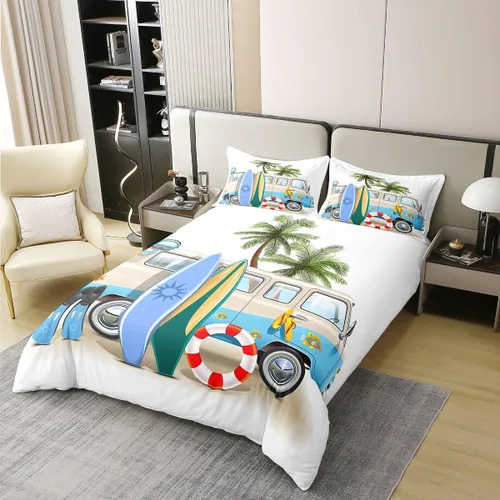 Funda de edredón 100% de algodón natural para cama Queen, juego de ropa de cama de autobús con tabla de surf de dibujos animados, palmeras