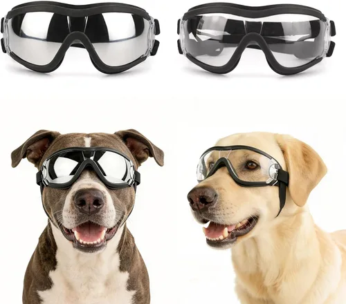 NAMSAN se enfoca en investigar suministros para mascotas, estas gafas de sol para perros están autorizadas por Namsan, que están hechas de lentes ultra duras de calidad, marco de PVC suave, 2 correas elásticas ajustables, duraderas y resistentes. Nuestras gafas para perros cumplen con el estándar de tasa UV, las lentes son resistentes a los rayos UV y antirreflejos. Las rejillas del marco pueden dispersar la niebla interior, mejorando la seguridad de protección de los ojos del perro. No sugerimos usarlos para nadar. El marco suave se adapta bien a la cabeza sin raspar la cara y los ojos del perro. Previene que gotas y piedras diminutas entren en los ojos del perro cuando el perro saca la cabeza por la ventana del automóvil. Protege los ojos de los perros cuando corren, esquian, viajan. Son excelentes suministros para la protección ocular al aire libre. Para perros medianos a grandes como Pastor Alemán, Pitbull, Lab, Gree, Husky, Doberman, Retriever, etc. No se recomienda para perros de gran tamaño como Terranova, Gran Danés, San Bernardo, etc. Longitud del marco: 6 pulgadas (15.24 cm), Altura: 2.36 pulgadas (6 cm). Correas elásticas para la cabeza: ≤14 pulgadas, correas elásticas de barbilla: ≤9 pulgadas. (Sin medida de tracción) Ajusta las correas después de ponértelas para evitar que los lentes se resbalen y dañen los ojos del perro.