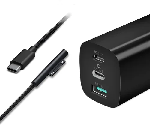 Compatibilidad: Microsoft Surface pro 10/7/6/5/4/3, Surface Laptop 6/3/2/1, Surface Go4/3/2/1. Este cable es compatible con Surface Pro 8/9, pero debido a limitaciones técnicas, el sistema mostrará "Carga lenta", pero la potencia es suficiente para que pueda trabajar y entretenerse normalmente. Hasta 39 W para dispositivos de superficie: asegúrate de utilizar el puerto USB-C1 para cargar tu superficie. Los dispositivos de superficie solo admiten voltaje de entrada de 15 V con dos potencias de carga: 15V2.6A y 15V4A. Por lo general, un cargador USB-C de 65W tiene una salida nominal de 20V3A y no proporciona una salida de 15V4A. Incluso con un cargador USB-C de 65 W, en realidad no puede lograr una potencia de carga de 15 V4A. Por lo tanto, la potencia de salida máxima para dispositivos Surface con este juego de cargadores es de 15V2.6A (39W). 【50% menos tamaño】Las especificaciones del cargador USB-C: 2.244 x 2.008 x 1.142 in, 3.95 onzas. La tecnología GaN se adopta para reducir en gran medida el tamaño de una estructura sólida pequeña, lo que la hace un 50% más pequeña que un cargador estándar de MacBook de 61 W. Todo el diseño delgado es práctico para el hogar y los viajes. Soporte multiprotocolo, salida máxima de 65 W para dispositivos USB-C generales: USB-C1 soporta PD3.0 y PD2.0, mientras que USB-C2 soporta PD3.0, PD2.0 y PPS (solo USB-C2 soporta PPS 3.3V-11V/5A). El puerto USB-A es compatible con QC3.0, QC2.0, SCP, FCP, AFC y más. Salida USB-C1 (o USB-C2): 5V/3A, 9V/3A, 12V/3A, 15V/3A, 20V/3.25A máx. Salida USB-C1+USB-C2: 45W+18W [63W]. Salida USB-C1+USB-A: 45W+18W [63W]. Salida USB-C2+USB-A: 5V/4.8A [24W]. Salida USB-C1+(USB-C2+USB-A): 45W+(15W) [total máximo 60W]. Calidad duradera: fabricada con materiales confiables y diseñada para un uso diario a largo plazo. Si experimenta algún problema, nuestro equipo de soporte lo ayudará rápidamente