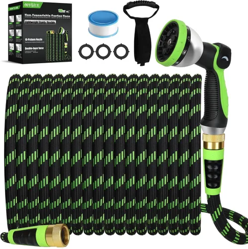 Non-expansion Design: The latest non-expansion garden hose in 2025. Say goodbye to the problems of traditional garden hose that are bulky, easy to age, easy to knot, and easy to break. OPPSIUE launches the latest non-expanding garden hose in 2025, which is made of thickened PVC material and high-density fabric, with reliable pressure resistance, burst resistance and wear resistance. It can resist puncture from sharp objects and can easily bypass trees, grass and walls, helping to prevent leaks and ensure long-term stable performance. Stable Water Flow: This 100ft non-expanding garden hose can maintain a stable and reliable water flow state without stretching or shrinking. At the same time, we increase the inner tube design and the outlet diameter, and increase the inner tube diameter to about 12mm, which can ensure a large and stable water flow. Innovative Extended Handle: The design of the extended rubber-coated handle protects the internal connection points made by full-coverage pressing technology. While increasing the comfort of use, it can better protect the garden hose connection and ensure complete pressure resistance and no leakage. Lightweight: OPPSIUE non-expandable hose is ultra-lightweight, more than 50% lighter than traditional hoses. Its flexibility and lightness ensure a more comfortable use experience. It can be flexibly curled and stored for easy storage and carrying. 10 Functional Spray Nozzle: Comes with an upgraded 10 function nozzle, one button to turn off and water flow size, and different water flow modes can be adjusted, such as spraying, direct spraying, dipping, etc., no matter whether you are cleaning your yard, taking care of your lawn or bathing your pets, it can satisfy your needs. Provide you with more choices and convenience.
