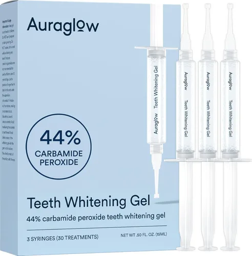 Gel blanqueador Auraglow, jeringa paquete de relleno, 44% Peróxido de Carbamida, (3) Jeringas de 0.17 onzas líquidas, +30 tratamientos.
