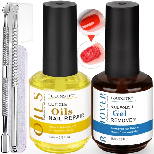 Professional Gel Nail Polish Remover Kit: The nail polish remover set contains a bottle of gel remover (15ml), cuticle oil (15ml), nail file and cuticle pusher. The new gel nail polish remover can quickly and effectively gently remove nail polish from nails, leaving your nails ready for the next DIY style! Great for beginners or those who change their nail style frequently! Easy to Use and Save Time: LOUINSTIC gel remover for nails is formulated with specially enhanced no added acetone and non-irritating organic solvents, which helps dissolve and break gel nail polish in 2-6 minutes, and the formula is gentle while ensuring removal efficiency, no foil, soaking or wrapping is required, protecting nails while saving time and money on going to the nail salon. Nutrient-Rich Cuticle Oil: The Nail gel remover kit contains a bottle of cuticle oil, which is rich in multivitamins and essential oils to soften and condition your cuticles, effectively reduce epidermal wrinkles, prevent nail cracking, repair and nourish the cuticles and promote healthy growth of nails, so that the nail surface restores gloss. Usage Tips: 1. Please note that before using gel nail polish remover, please file off the top coat completely. 2. It usually takes 2-5 minutes to work. The thicker the gel coating, the more nail polish remover is needed and the longer it takes. 3. After removing the nail polish, drop a drop of cuticle oil on each cuticle and massage gently. It can be used every day to repair and nourish your nails and grow healthily. Reliable Service: LOUINSTIC is committed to providing high-quality nail polish removers and services. If there is a leaking or dry bottle, please contact the service staff in time,we will provide replacement or refund service in time, and you can get a relaxed shopping experience. Please enjoy your manicure with confidence and share your beauty with the world!